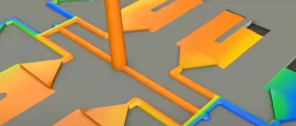 下面我們用顏色來劃分,主流道分流到用顏色劃分,橙色的是溫度高的地方,那么溫度高的地方流動是快的,在它首次分支的時候就是,在這個地方十字分支的時候,它的這個橙色的溫度依然是高溫部分,所以它流動的更快,會導致中間四穴提前打滿,那么邊角的四穴它是藍色和這個綠色部分,那么它的溫度是低一些的,它流動的就更慢一些,導致流動會不均衡。
