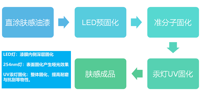 UV準(zhǔn)分子膚感涂層是利用納米分子技術(shù),通過準(zhǔn)分子燈能使漆膜固化后在表面形成褶皺,因漆膜特有的肌膚觸感而得名,讓裝飾面變得更為細(xì)膩。在觸感上有嬰兒般肌膚的嫩滑,視覺呈現(xiàn)上它又極啞無光,飾面光感啞至0-5°,表面細(xì)膩光滑,親膚的觸感和高雅的質(zhì)感,同時(shí)具有良好的耐污、耐刮、耐磨性能,可以賦予產(chǎn)品表面全新的質(zhì)感,迅速成為消費(fèi)者的青睞與客戶的肯定。